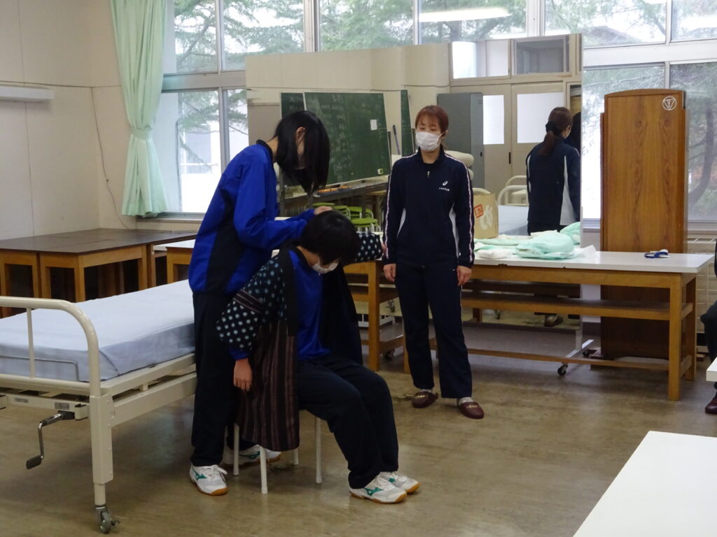 介護体験では、福祉や介護を身近に思えるような分かりやすい例えや事例を紹介していただきながら、衣服の着脱・おむつ交換・立ち上がり・移乗について、ボディメカニクスや脱健着患等のコツやポイントを押さえて指導していただきました。