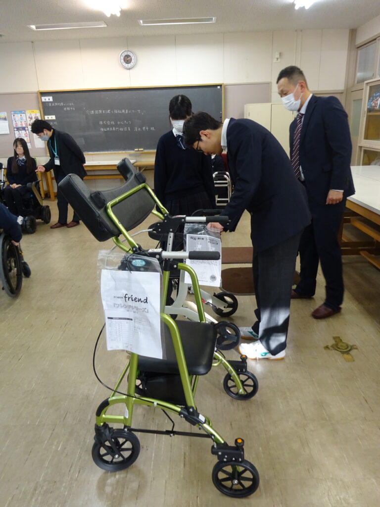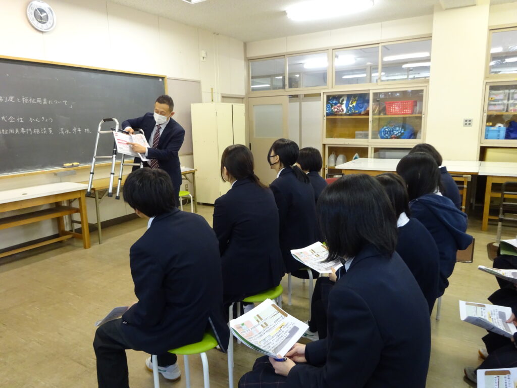 11月19日(水)に、にかほ市社会福祉協議会様による「介護体験」を、26日(水)に、株式会社かんきょう様による「介護保険制度と福祉用具について」の講話と体験学習会を行いました。