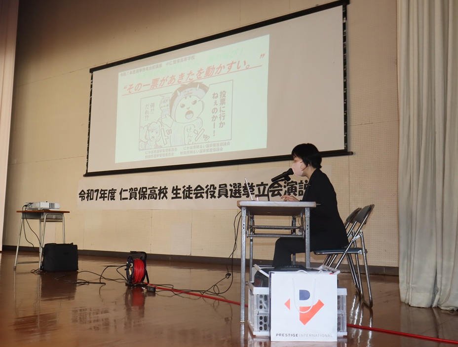 選挙啓発講座の終了後、生徒会役員選挙の立ち会い演説会が行われました。立候補した四名は、それぞれが目標にしている生徒会でやりたいことや、もっとこうしたいことを全校生徒に訴えました。各クラスの選挙管理委員が「投票所入場券」を全校生徒に配付して、各学年ごとに、本物の投票箱/記載台/投票用紙を使用して投票しました。投票立ち会い人や投票管理者は、にかほ市明るい選挙推進協議会の皆さまが担当してくださいました。改めて、にかほ市の御指導・御支援に感謝申し上げます。