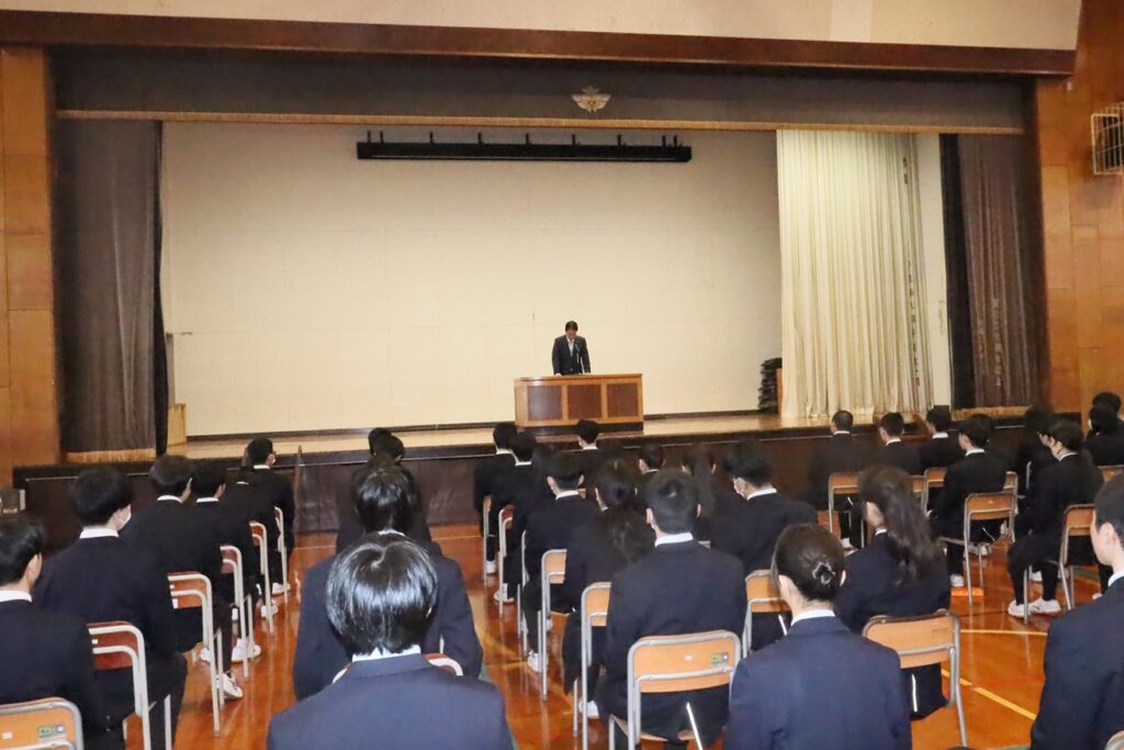 続いて、修了式が行われました。木村校長が、令和7年度を振り返りながら、リベリア共和国との国際交流や、大阪・関西万博2025へ生徒代表が参加したこと、学習センターの開設など、にかほ市と様々な協業を行ったこと、次年度に向けて「各学年の生徒が自分自身の目標を持って取り組みましょう」と、お話をいただきました。