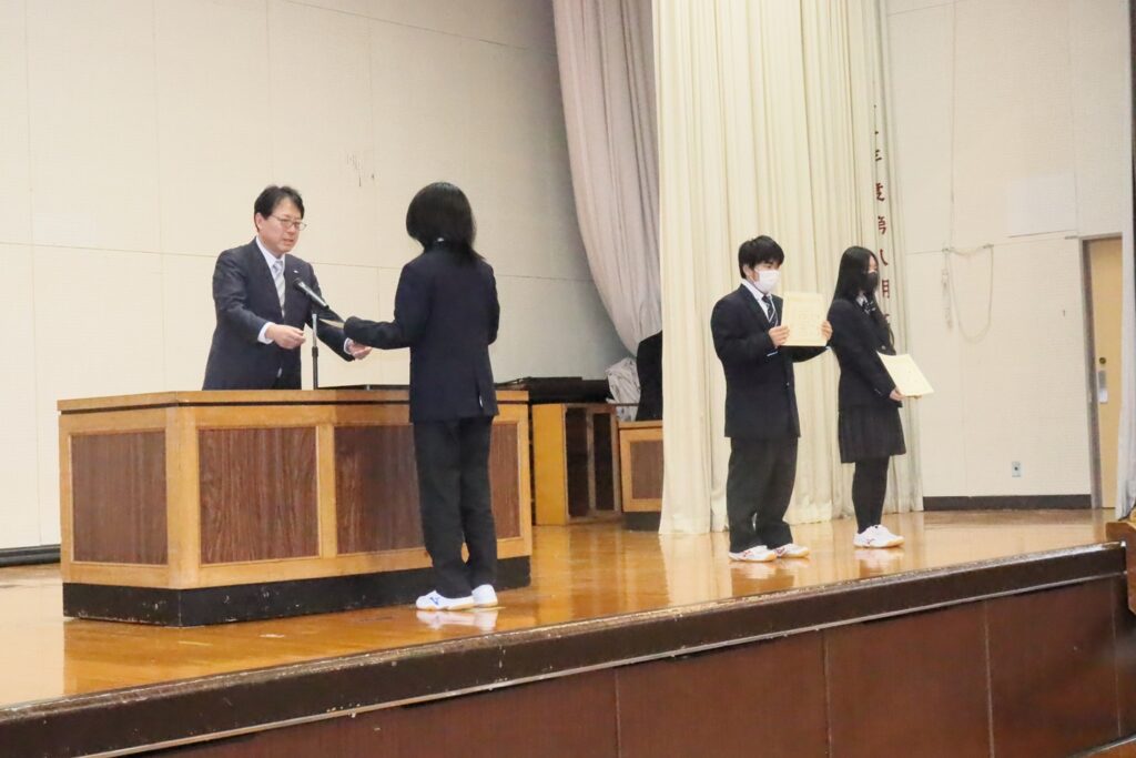 賞状伝達式では、第48回由利本荘・にかほ高校美術展で入賞した美術部の生徒2名と、第21回にかほ市読書感想文事業で受賞した生徒1名が登壇して、木村校長から賞状が伝達されました。