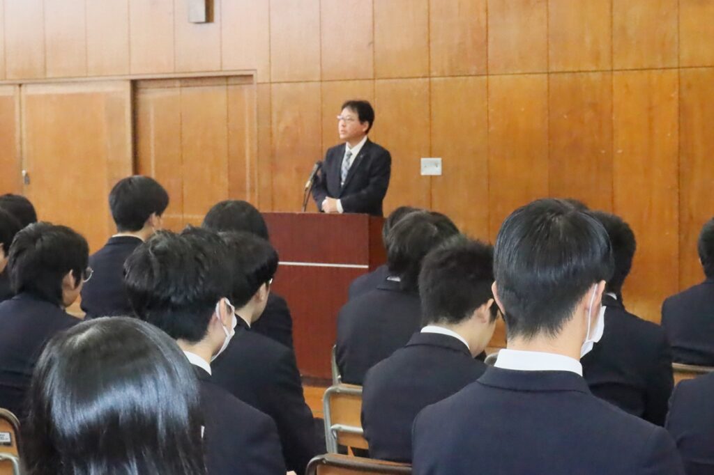 生徒会任命式では、11月27日(木)に行われた生徒会役員選挙で当選した生徒会長、生徒会副会長、応援団長の3名に、校長先生から任命状が手渡されて、新しい生徒会執行部が発足しました。新生徒会長からは就任の決意表明あいさつがありました。